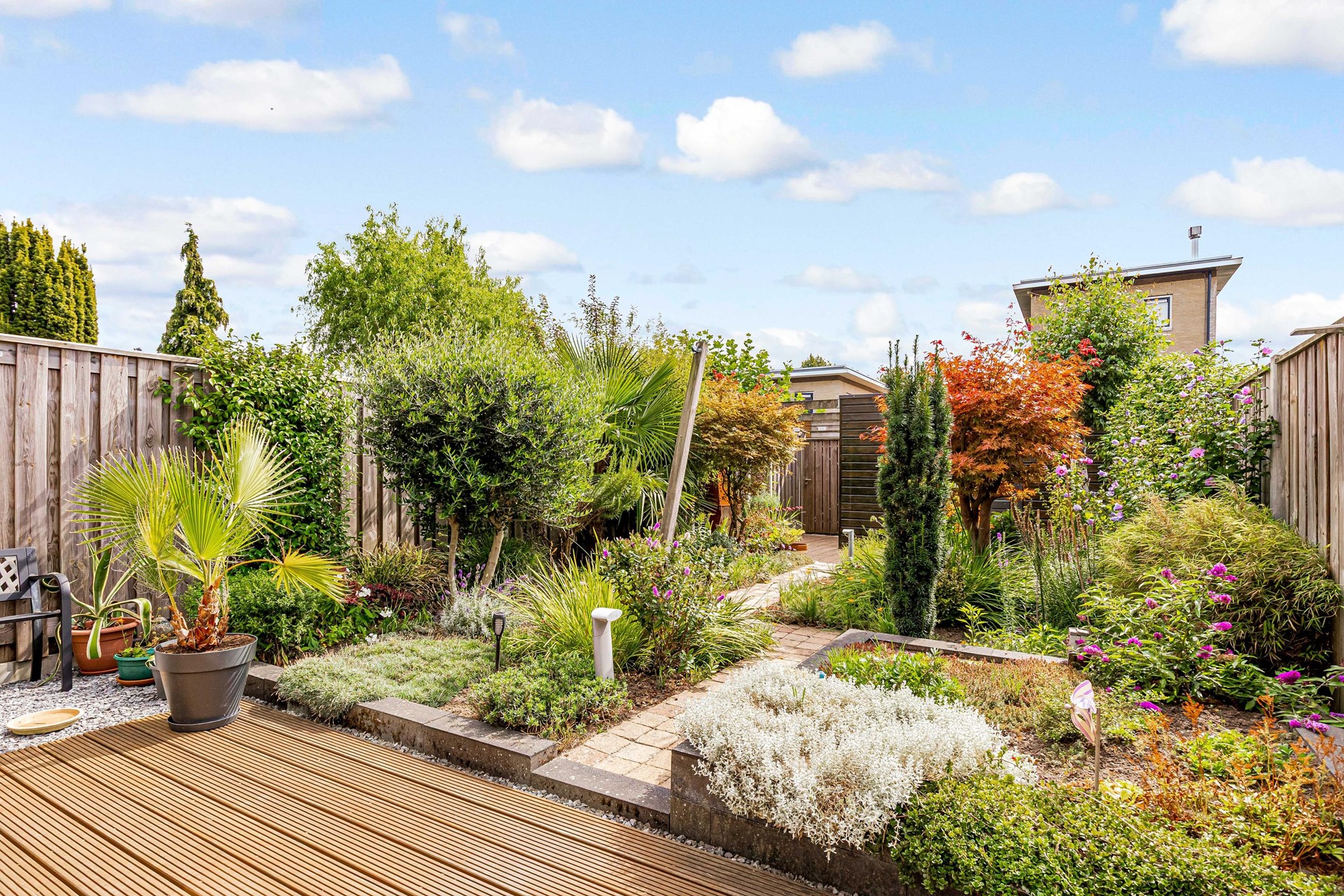 De achtertuin is verzorgd en smaakvol aangelegd met diverse beplanting, groene borders en een ruim terras. Dankzij de ligging op het zuiden geniet u hier vrijwel de hele dag van zon. De tuin biedt daarnaast voldoende privacy en is overzichtelijk en onderhoudsvriendelijk ingericht, waardoor u optimaal gebruik kunt maken van de buitenruimte. Achterin bevindt zich een houten berging van circa 10,4 m², voorzien van elektra, en er is een praktische achterom aanwezig.