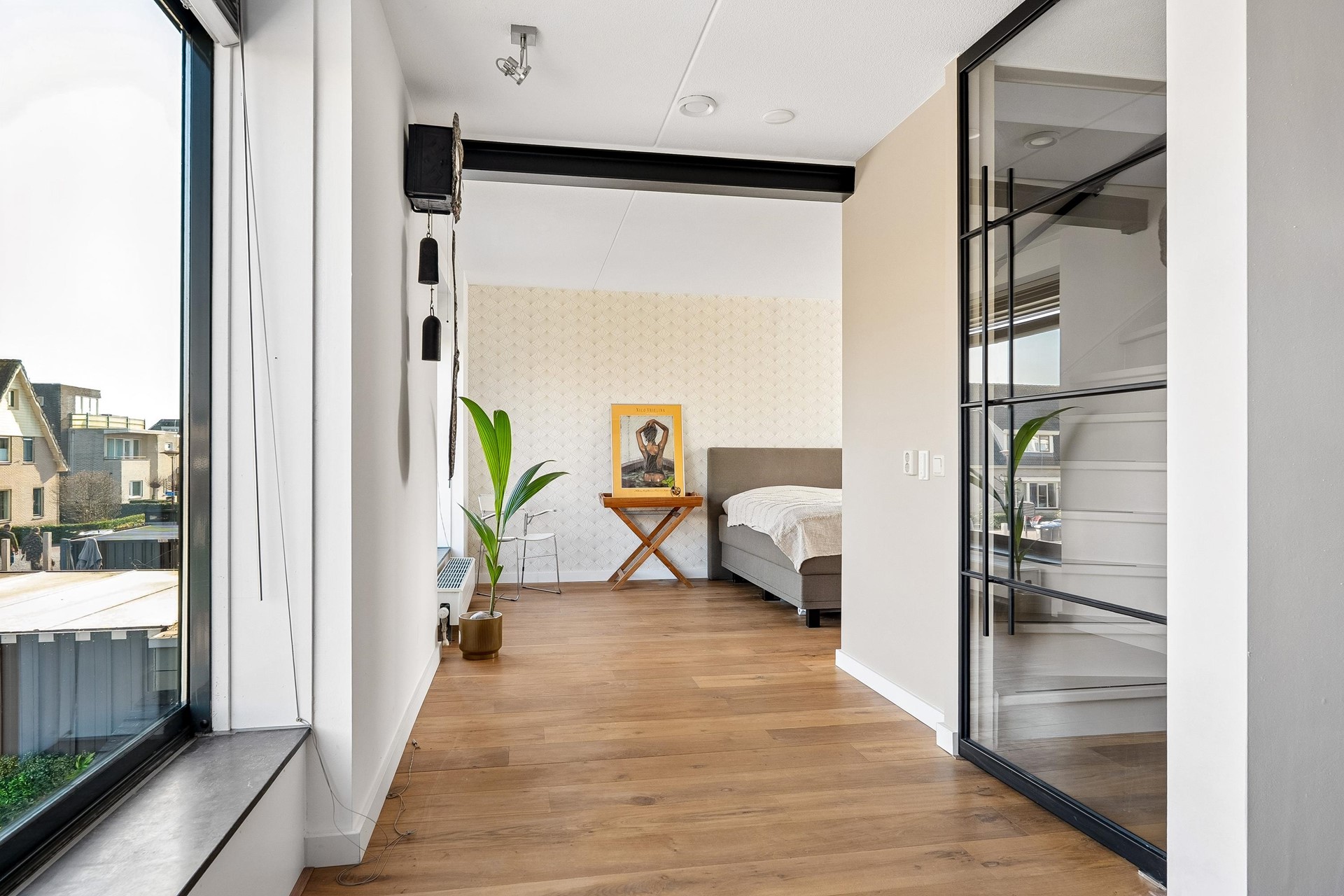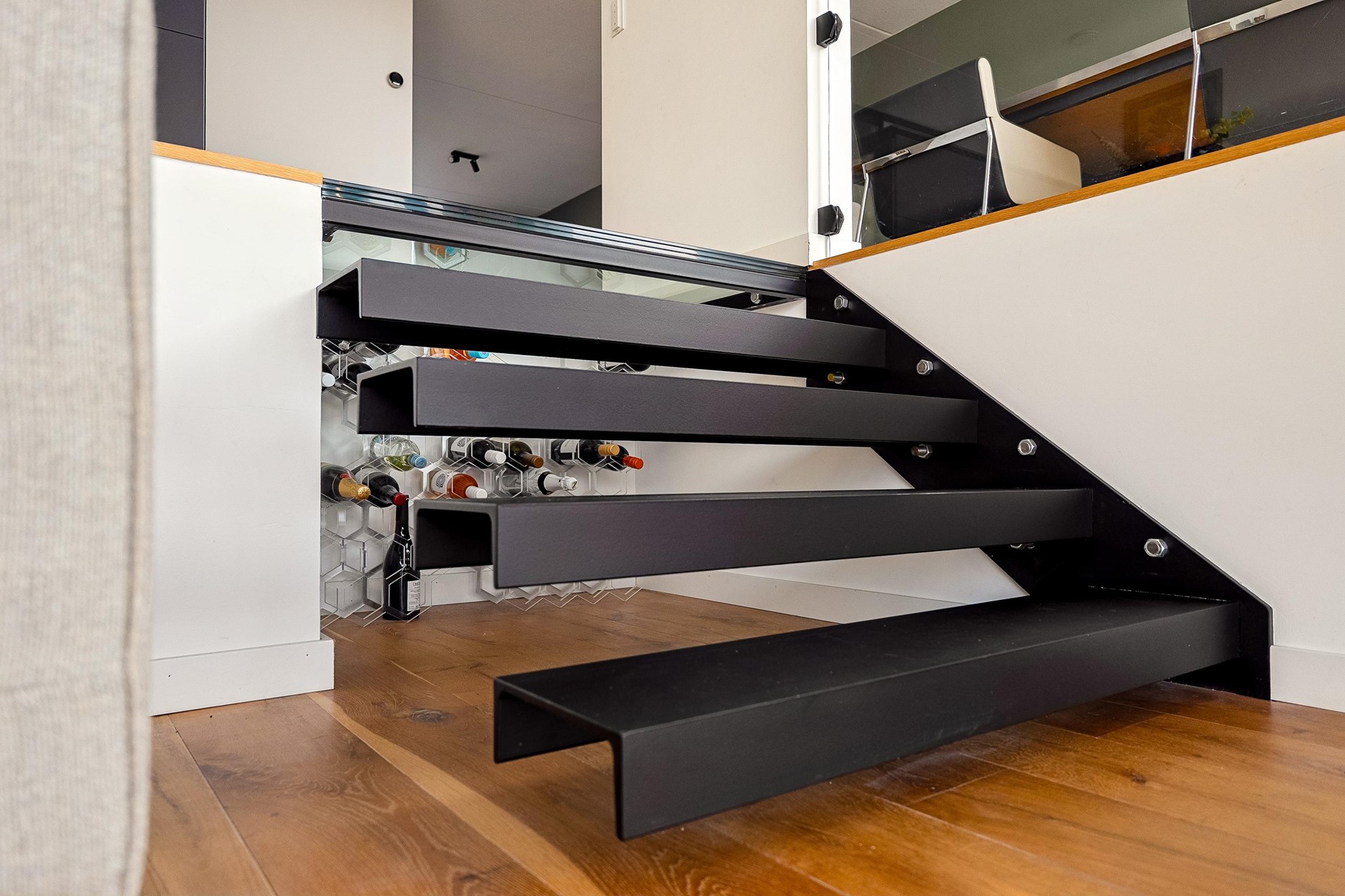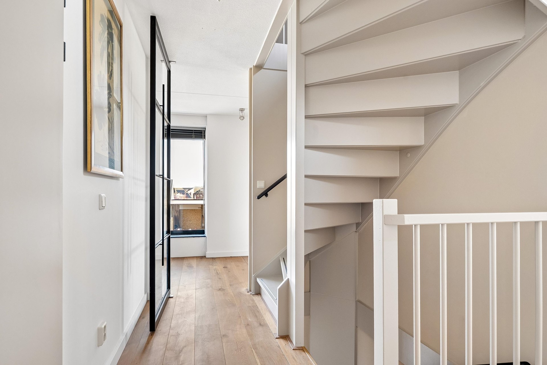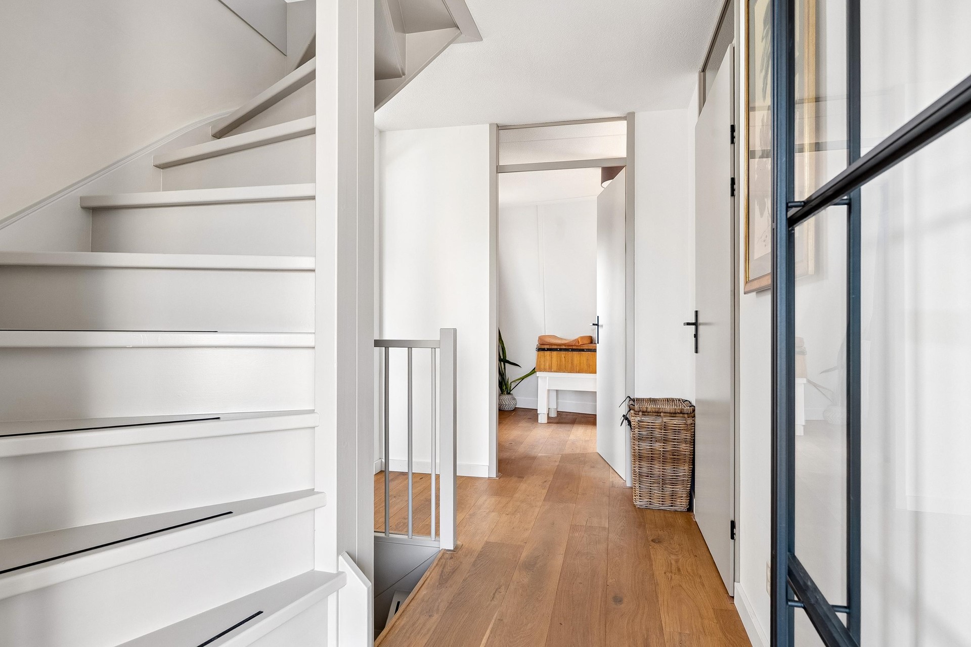 - Stalen deuren en zwevende trap met glas