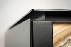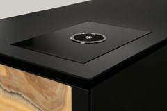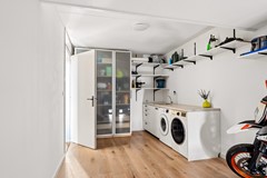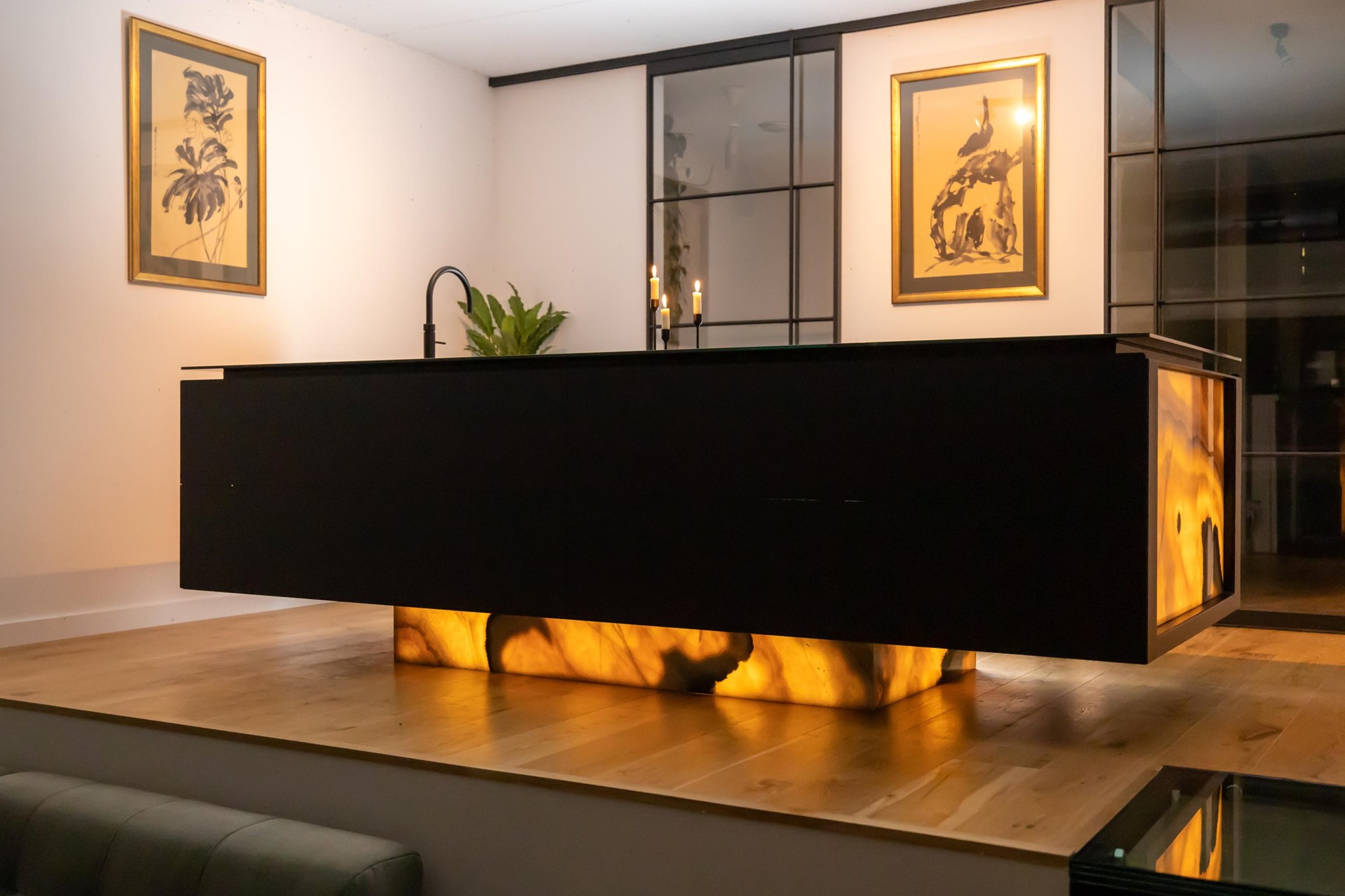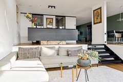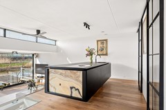 De woning is speels ingedeeld met een split-level woonruimte. Op het eerste niveau bevindt zich de luxe, custom made en exclusief op maat ontworpen keuken, met een indrukwekkend kookeiland van circa 3,0 x 1,20 meter. Het eiland is vervaardigd uit staal en afgewerkt met een zwarte fijn-structuur poedercoating, gecombineerd met een stijlvol 10 mm zwart glazen werkblad. De keuken is uitgerust met hoogwaardige apparatuur, waaronder een BORA kookplaat en Quooker. Het kookeiland rust op een verlichte onyx sokkel, een exclusieve natuursteen dat licht doorlaat, waardoor een bijzonder elegant en zwevend effect ontstaat.