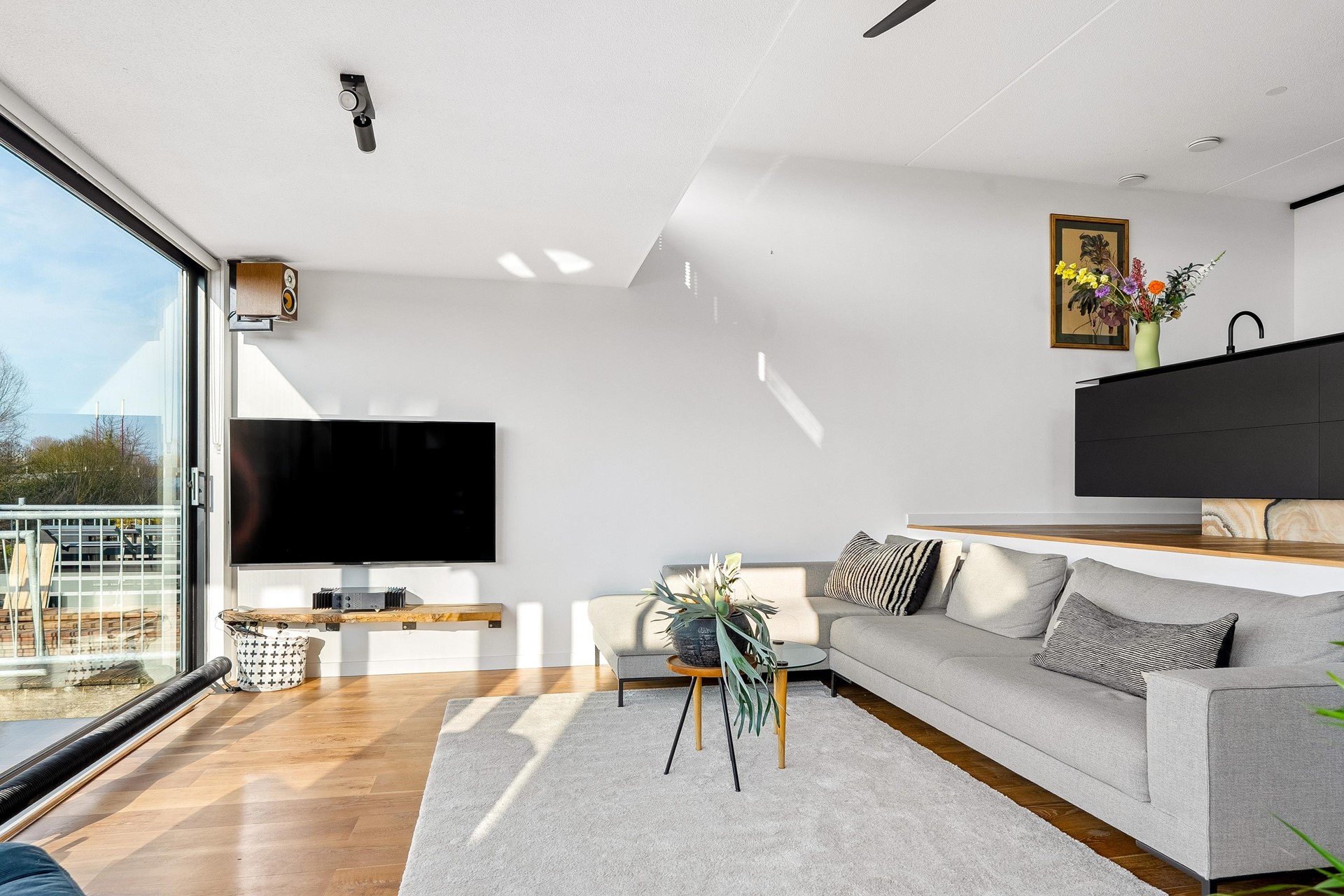 Via een korte trap bereikt u het lager gelegen woongedeelte. Hier bevindt zich de sfeervolle woonkamer met houtkachel en een prachtig uitzicht over het water. Aan de voorzijde is een extra zitruimte, ideaal als tv-kamer of speelruimte.