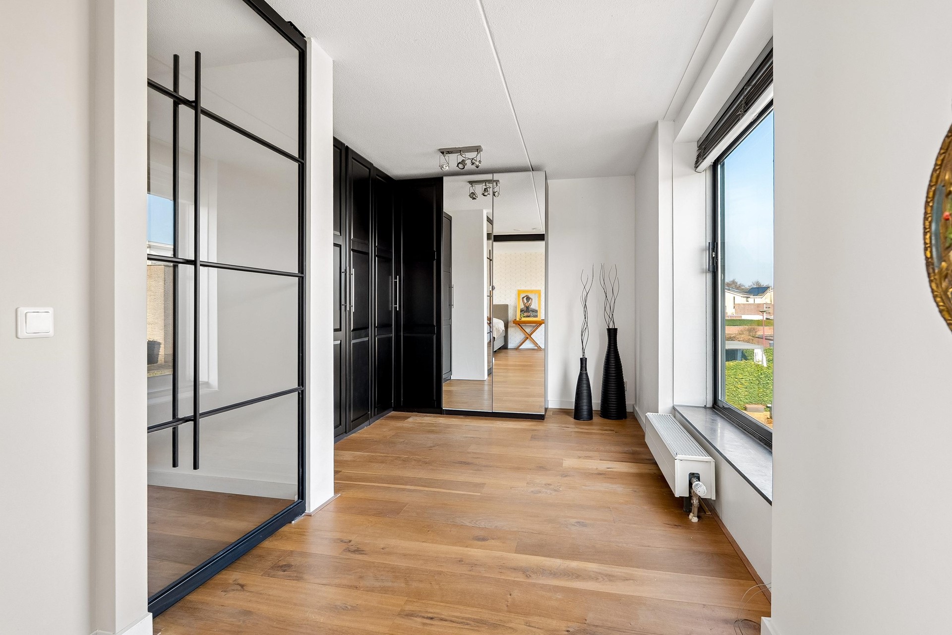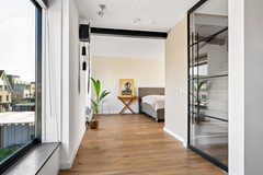 De royale master bedroom aan de voorzijde is circa 29 m² groot en strekt zich uit over de volledige breedte van de woning. Deze kamer is ontstaan door het samenvoegen van twee slaapkamers en is indien gewenst eenvoudig weer terug te brengen naar drie volwaardige slaapkamers.