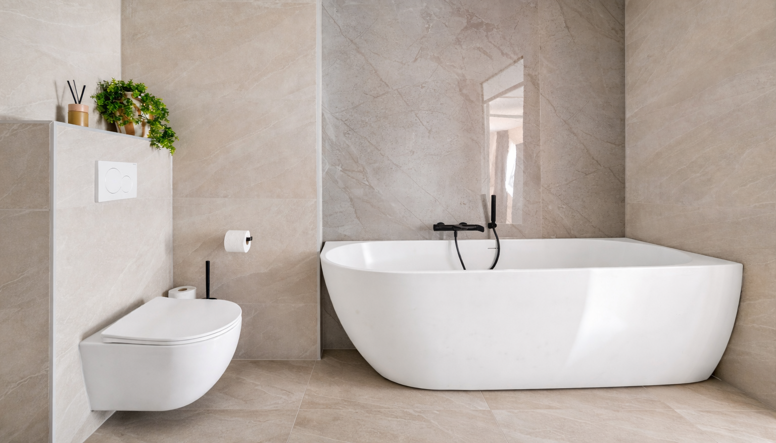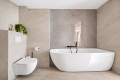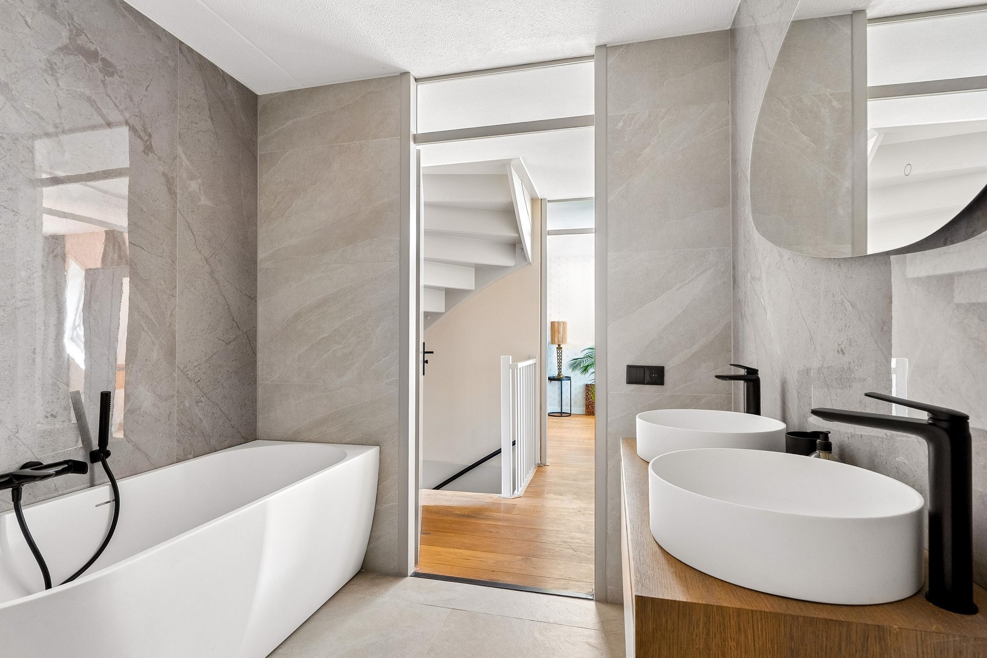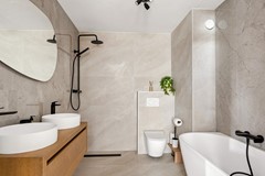 De badkamer (2026) is modern en luxe uitgevoerd en beschikt over een design ligbad, een inloopdouche met stortdouche, een zwevend toilet, een dubbele wastafel en vloerverwarming.