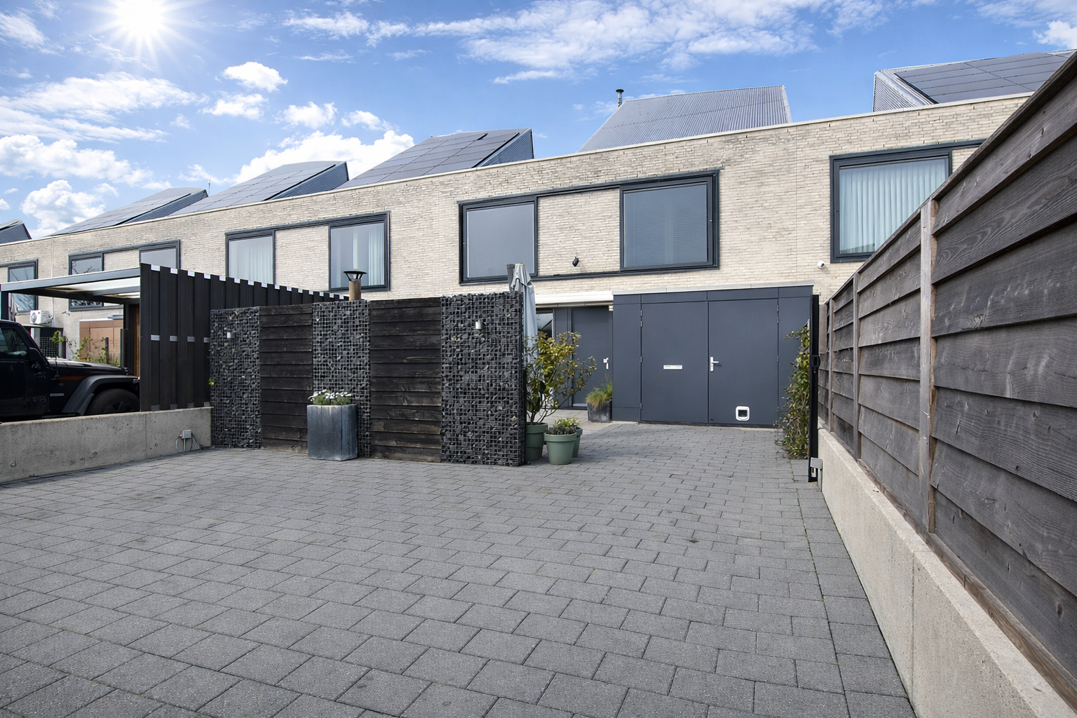 Aan de voorzijde bevindt zich een verzorgde voortuin met schanskorven en een vaste barbecue, evenals een ruime oprit met plaats voor drie auto’s op eigen terrein.