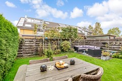 De achtertuin is verzorgd aangelegd met gazon, terras, beplanting en lijnbomen en biedt volop ruimte om van het buitenleven te genieten. De garage (ca. 5,13 x 2,94 m) biedt plaats aan een auto, fietsen en extra bergruimte.